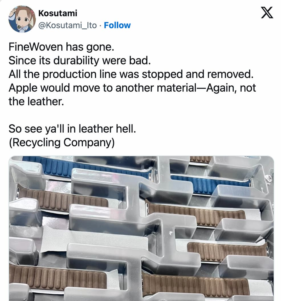 爆料者Kosutami表示,苹果内部似乎已经放弃改善 FineWoven 精细织纹材质