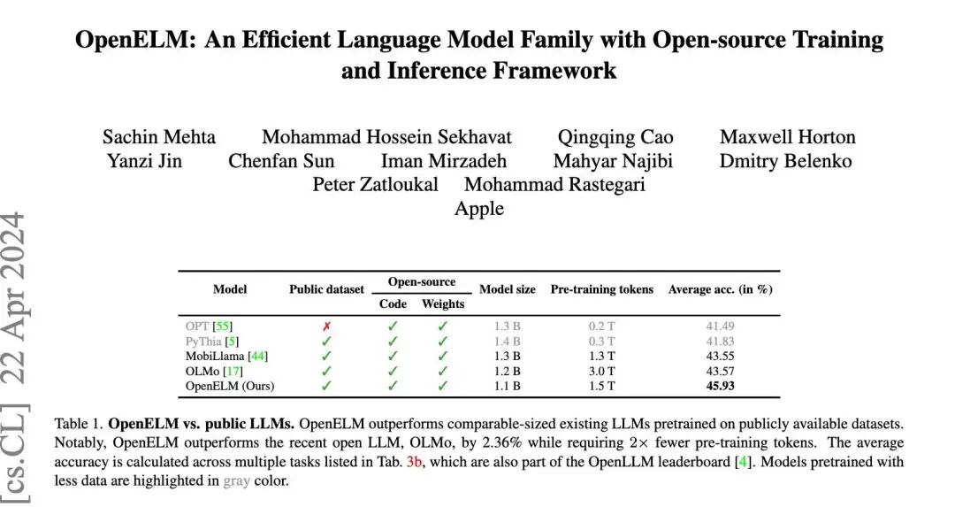 开源最近成了 AI 圈绕不开的高频热门词汇。先有 Mistral 8x22B 闷声干大事,后有 Meta Llama 3 模型深夜炸场,现在连苹果也要下场参加这场激烈的开源争霸赛。近日,苹果宣布在全球最大 AI 开源社区 Hugging Face 发布了 OpenELM 系列模型。苹果的开源大模型,在行业什么水平在介绍苹果的 OpenELM 之前,先对一些热门的开源模型做一个简单的对比:型号尺寸:Meta 开发的 Llama 3 模型拥有最大的规模,目前已发布的模型参数数量高达 700 亿。微软的 Phi-3-mini 模型具有 38 亿个参数,而更大的 Phi-3 系列模型分别拥有 70 亿和 140 亿。苹果推出的 OpenELM 模型提供多种规格,参数量分别为 2.7 亿、4.5 亿、11 亿和 30 亿。