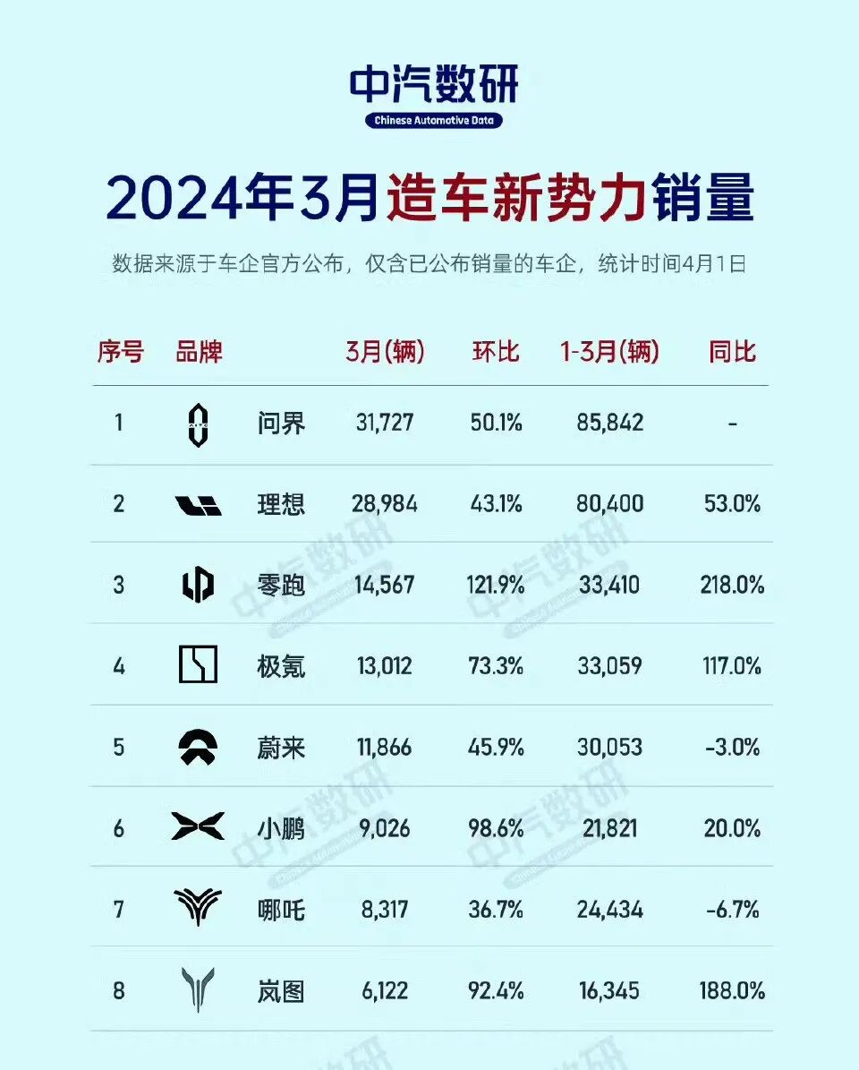 2024年3月,问界全系交付新车31727辆,蝉联中国新势力品牌销量冠军。其中,问界新M7单月交付量达24598辆,再次登顶中国新势力品牌车型销量第一。