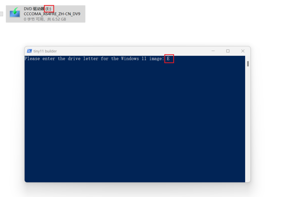 提前下载好官方原版Windows11镜像(点击下载),下图提示要求输入Windows 11镜像的盘符:只需双击ISO镜像,系统自动以文件资源管理器打开。比如在我的系统中,显示盘符为E,所以我在下图中输入“E”(不要输入冒号),回车确认进入下一步。