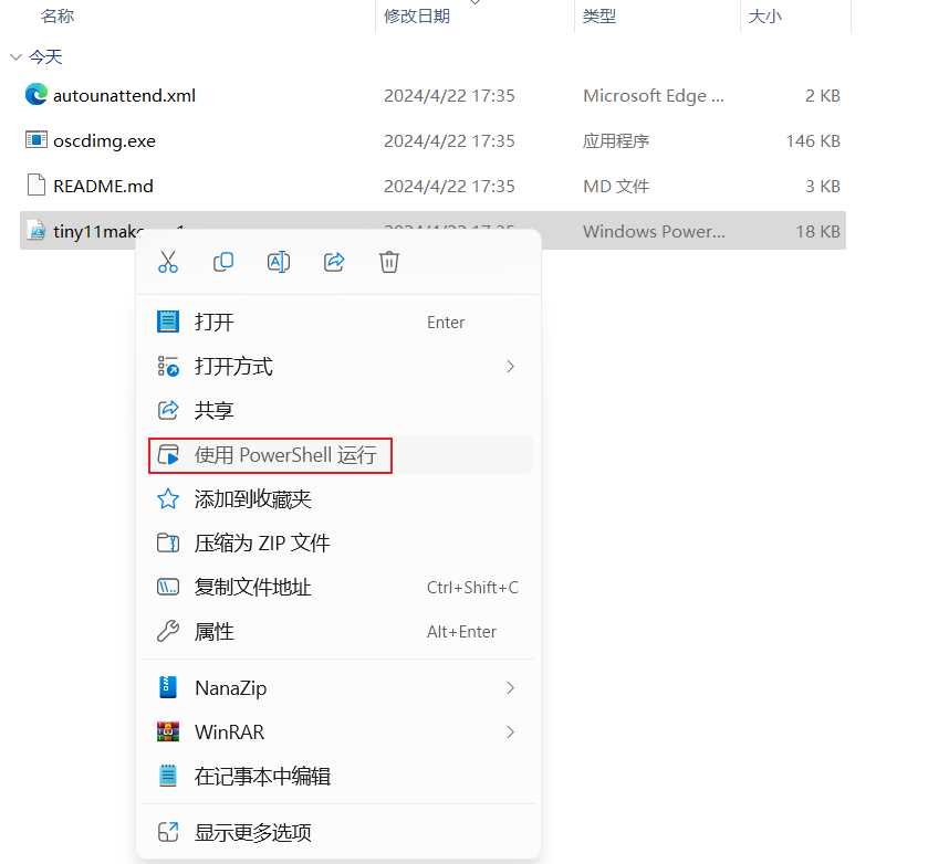 ①将「tiny11builder」解压,在文件“tiny11maker.ps1”上鼠标右键→使用PowerShell运行。