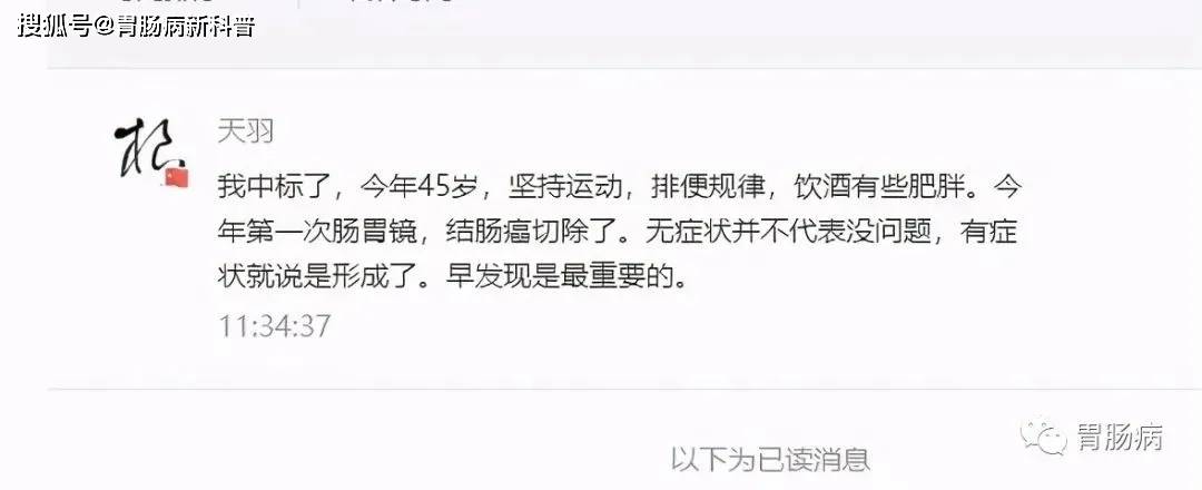 昨天,一位读者朋友给我留言:“我中标了,今年45岁,坚持运动,排便规律,饮酒有些肥胖。今年第一次肠胃镜,结肠癌切除了。无症状并不代表没问题,有症状就说是形成了。早发现是最重要的。”