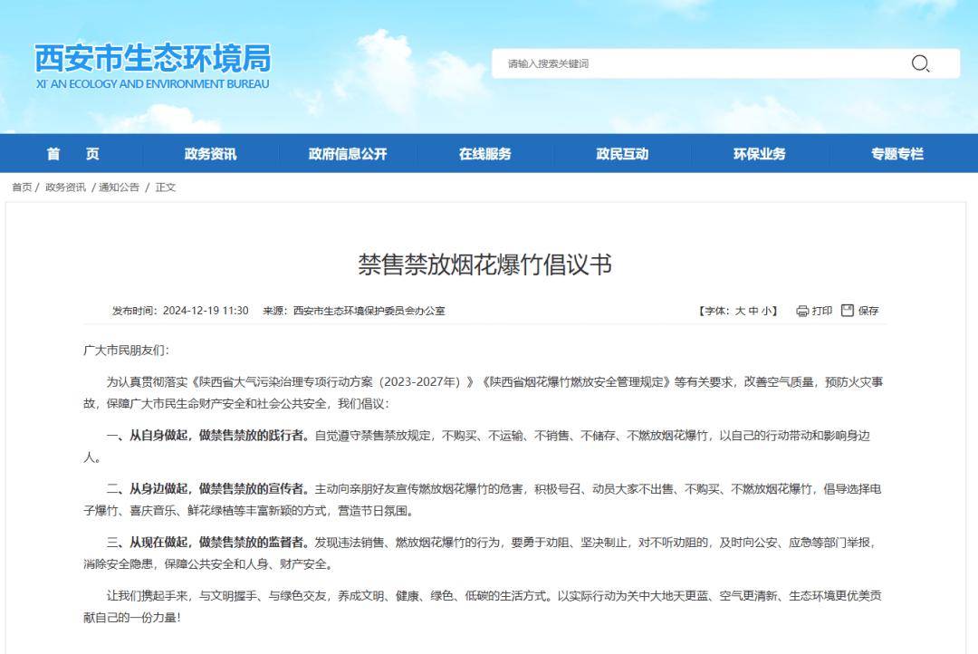 2024年12月19日西安发布《禁售禁放烟花爆竹倡议书》: