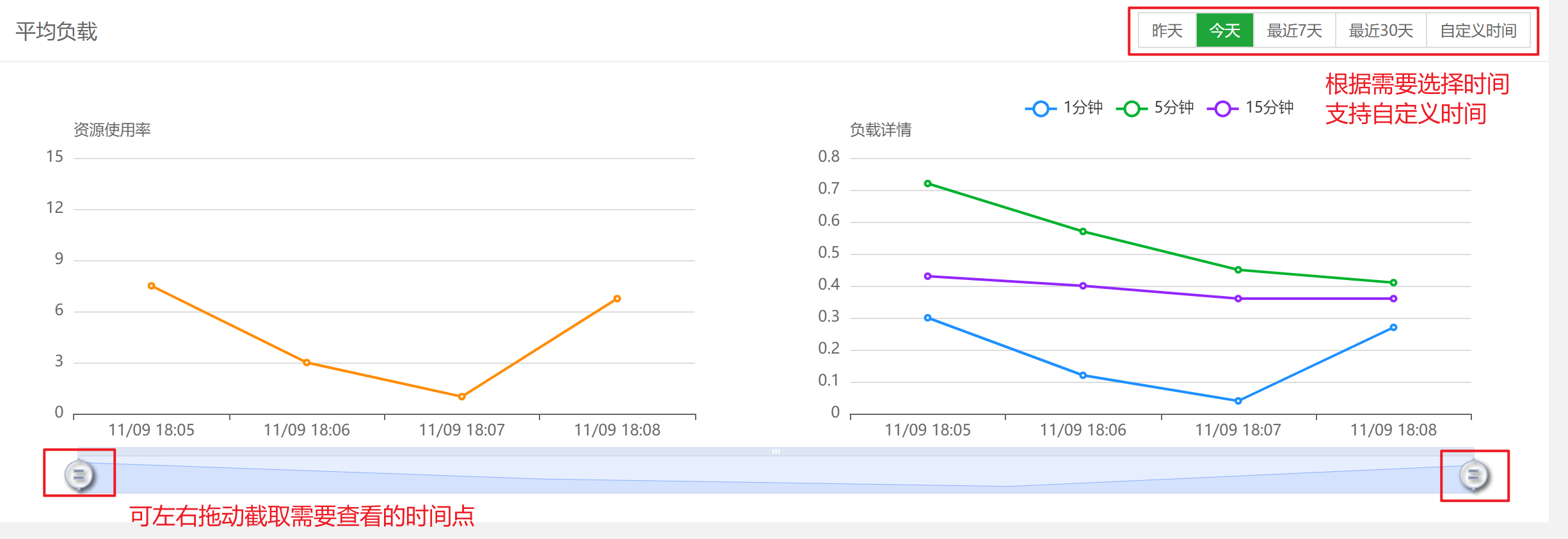 监控项有:平均负载、CPU、内存、磁盘IO、网络IO