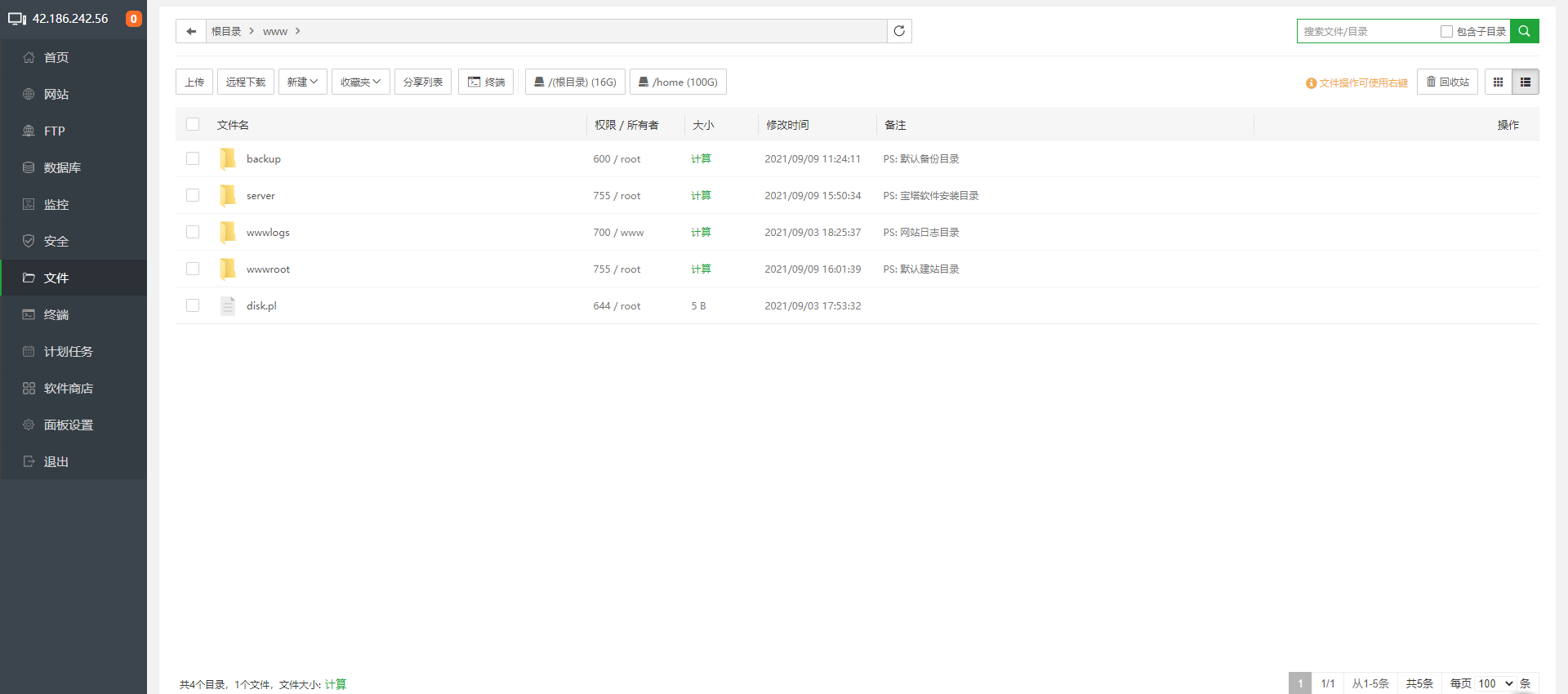 首页可查看到服务器状态、概况、软件、流量等情况;