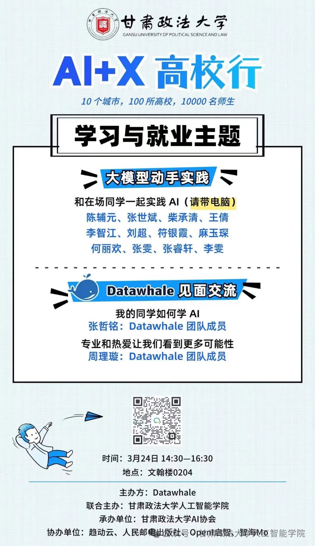 本次活动由Datawhale主办,甘肃政法大学人工智能学院联合主办,AI协会承办,并得到趋动云、人民邮电出版社、Openl启智和智海MO的协办支持。