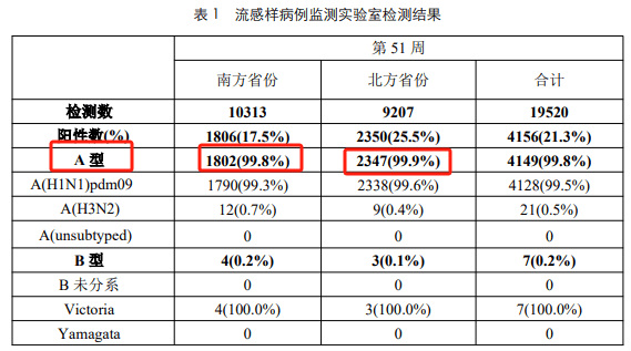 ◎ 12月26日发布的流感监测周报: 南、北方省份检测到的流感各型别及亚型的数量和所占比例。/ 图:中国国家流感中心