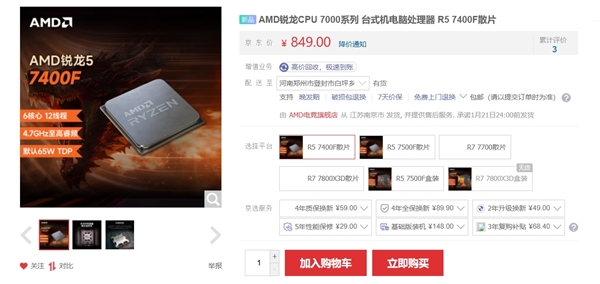 快科技1月19日消息,悄无声息,AMD最入门的AM5 CPU、超高性价比的锐龙7000系列新品——锐龙5 7400F,已经在中国正式上市,定价849元(约116美元),比预想中还要便宜。目前,京东电竞旗舰店已经上架了锐龙5 7400F的散片,现在下单,最迟21日24点前发货。