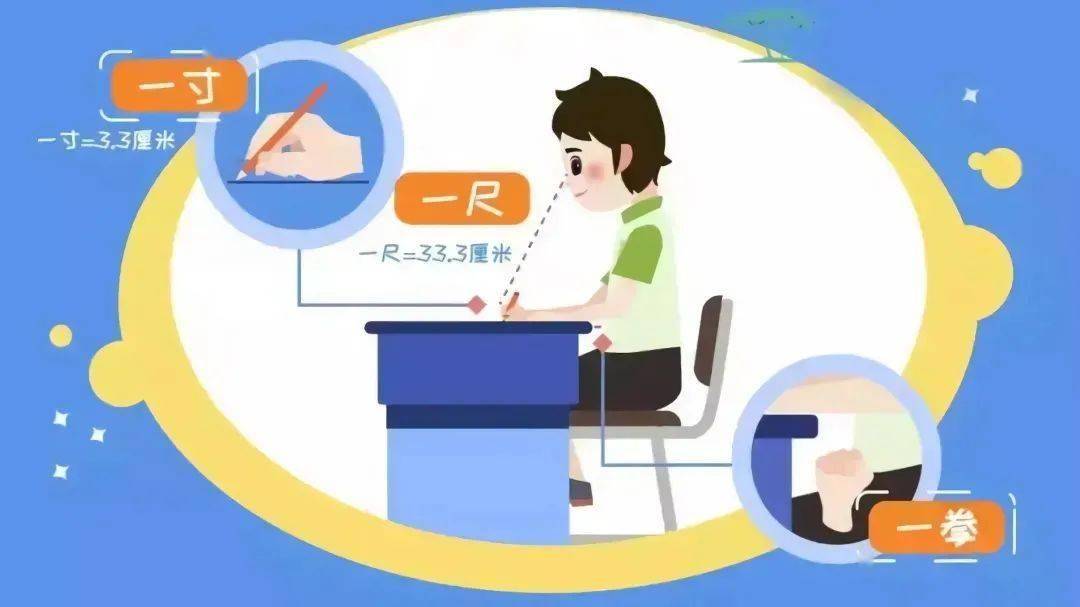 读写姿势要端正防控要点请记牢学生阅读书写时,桌椅高度要合适, 做到书本离眼睛一尺(约33厘米)、 胸口离课桌一拳(约10厘米)、 握笔手指离笔尖一寸(约3厘米)。