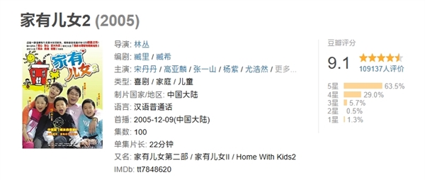 值得注意的是,《家有儿女》第二季比第一季的豆瓣评分更高,达到9.1分,是难得的口碑神作。