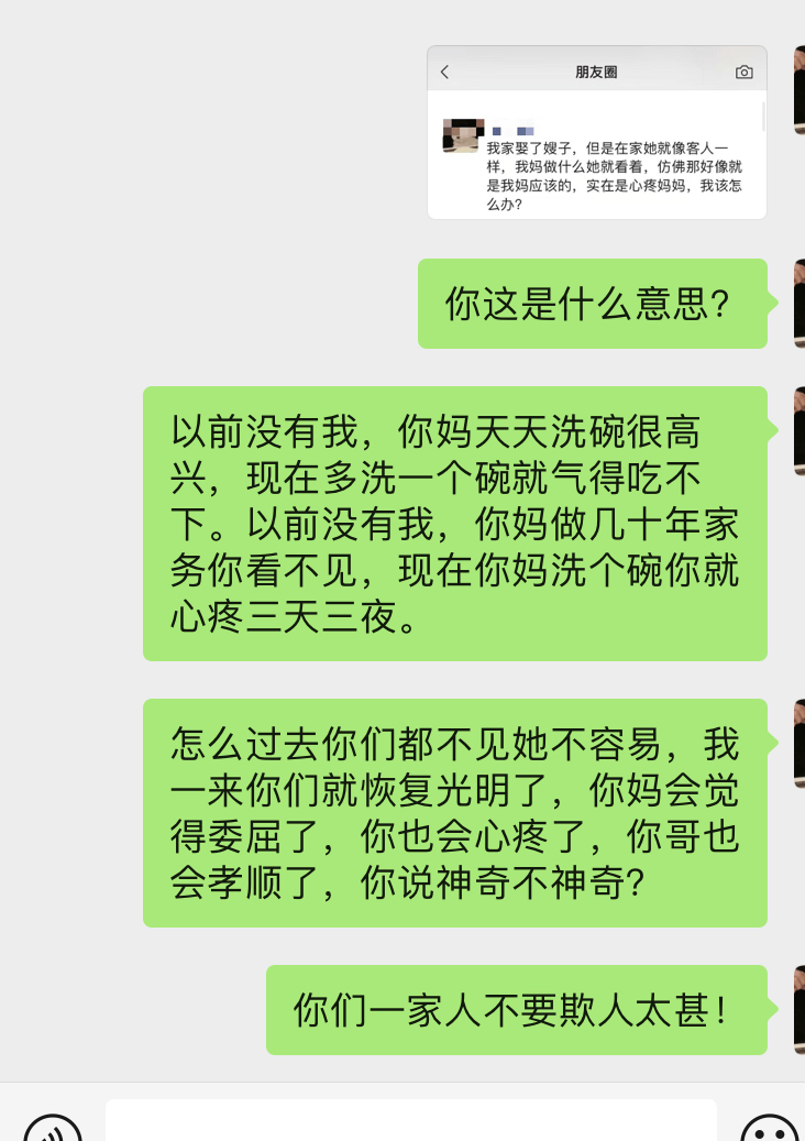 以前没有我,你妈做几十年家务你看不见,现在你妈洗个碗你就心疼三天三夜。
