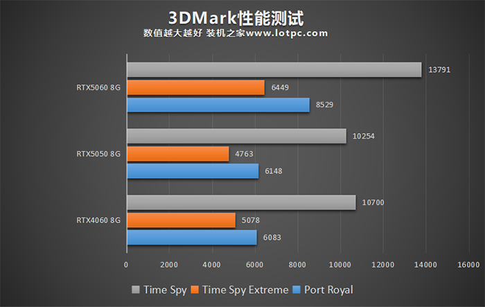 参数方面,RTX5050采用GB207-300核心,只配备了2560个CUDA单元,相比上一代RTX 4060减少了16.6%。RTX5050算是50系列唯一没配备GDDR7显存的型号了,显存与RTX4060相同,均为8G/128Bit的GDDR6显存,但是显存带宽和频率有所提升,为320GB/S显存带宽、20Gbps显存频率。单纯从参数上看,性能肯定是不如RTX4060的,不过让人不理解的是,性能没干过RTX4060的情况下,但功耗却比RTX4060高了15W。我们先来看看RTX5050对比RTX4060以及RTX5060的显卡跑分情况吧,进一步了解三者的性能差距。