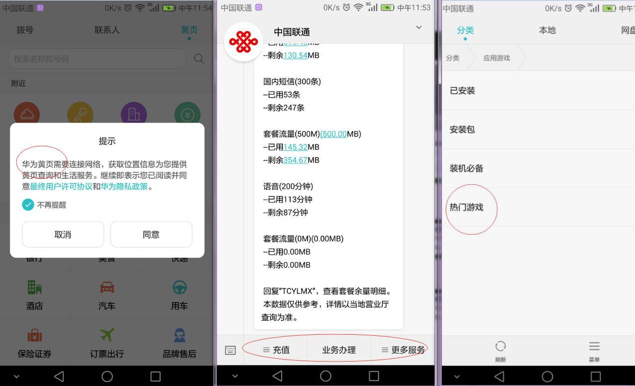 最后上几张图,某人说华为不会上广告,请看emui4.0加入了什么,智能短信烦的一塌糊涂,文件管理里面竟然有热门游戏推荐,还有那烦人黄页。