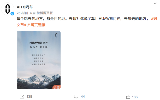 3月8日,华为与赛力斯联手打造的AITO汽车在官方微博和微信公众号平台发布“妇女节宣传海报”,其中海报内容使用了“HUAWEI问界”全新标语,而大家熟知的“AITO问界”则没有出现。随后,华为终端官方微博账号也转发了这条微博,并配文表示:“想去的地方,HUAWEI问界汽车,始终陪伴你!”